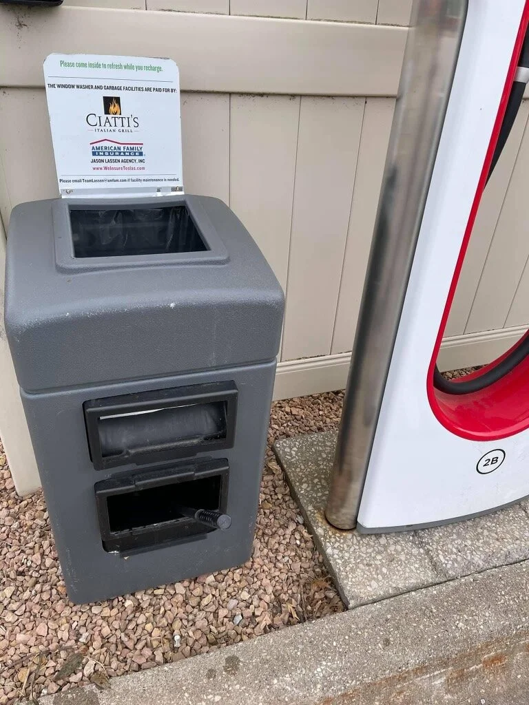 Garbage cans at SuperChargers are occasionally not emptied when full and, as a result, trash starts to coalesce around the area. Unfortunately, this reflects poorly on the Tesla community. We have also noticed that window squeegees, available at select SuCs, might be cracked or missing.
